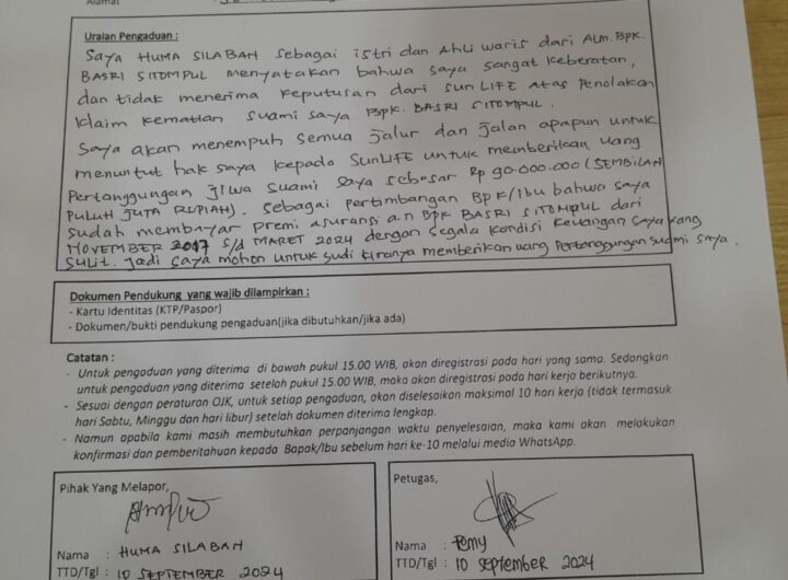MEDAN – Huma Silaban (68), selaku pewaris polis asuransi jiwa Sun Life dari Alm. Basri Sitompul merasa...