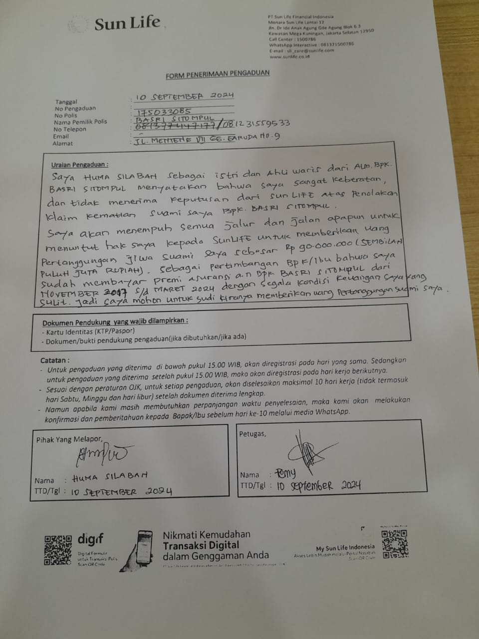 Maka pembayaran klaim atas Alm. Basri Sitompul harus dibayarkan oleh pihak asuransi Sun Life karena telah menerima pembayaran premi. Saya berharap kepada pihak Sun Life untuk segera melunasi pembayaran klaim meninggal dunia alm. Basri Sitompul kepada ahli warisnya, jelasnya. (*)
