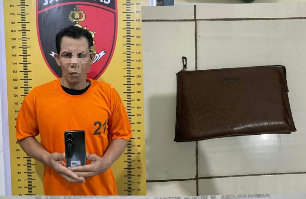 Kemudian Tim melakukan penggeledahan di rumah pelaku dan ditemukan di dalam sebuah lemari yang berada di dalam kamar pelaku satu (1) buah tas tangan warna coklat yang berisikan 1 unit Hp android merk Oppo A58 warna hitam yang merupakan salah satu Hp milik korban yang hilang.”katanya.