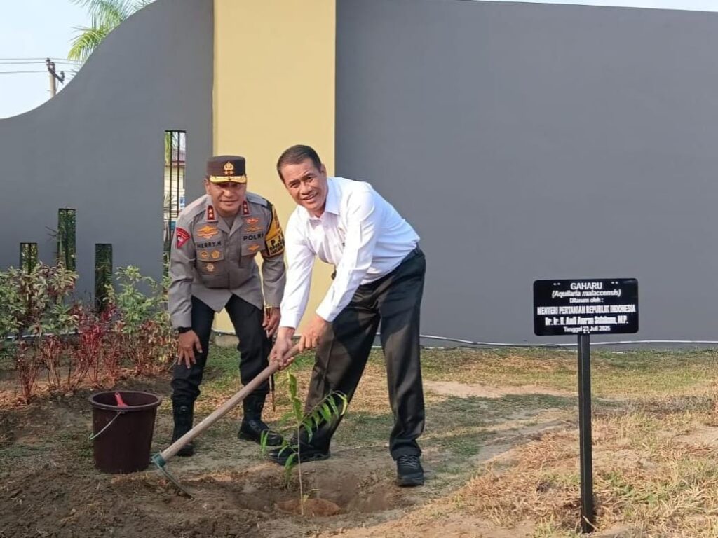 Menteri Pertanian melaksanakan kegiatan penanaman pohon Gaharu di halaman Mapolda Riau dalam rangka program Green Policing, Kehadiran Menteri Pertanian disambut oleh Kapolda Riau Irjen Pol Dr. Herry Heryawan, SIK, MH, M.Hum, didampingi oleh Wakapolda Riau Brigjen Pol Jossy Kusumo, SH, M.Han, Para Pejabat Utama Polda Riau serta Personel Polda Riau.