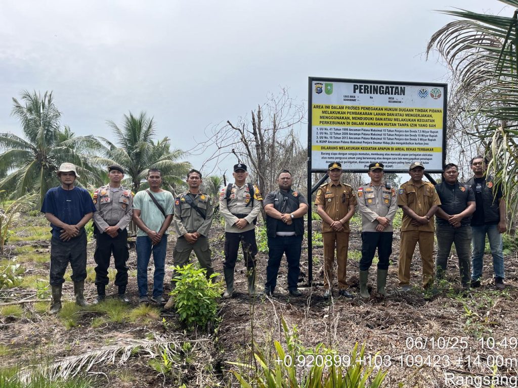 Patroli24jam. Meranti – Dalam upaya pencegahan kebakaran hutan dan lahan (Karhutla), telah dilaksanakan kegiatan Pemasangan Papan Plang Peringatan Karhutla di lahan Milik Saudari HERNAWATI di Desa Tanjung Medang Kecamatan Rangsang Kabupaten Kepulauan Meranti Provinsi Riau, Senin 6 Oktober 2025 sekira jam 11.30 Wib.