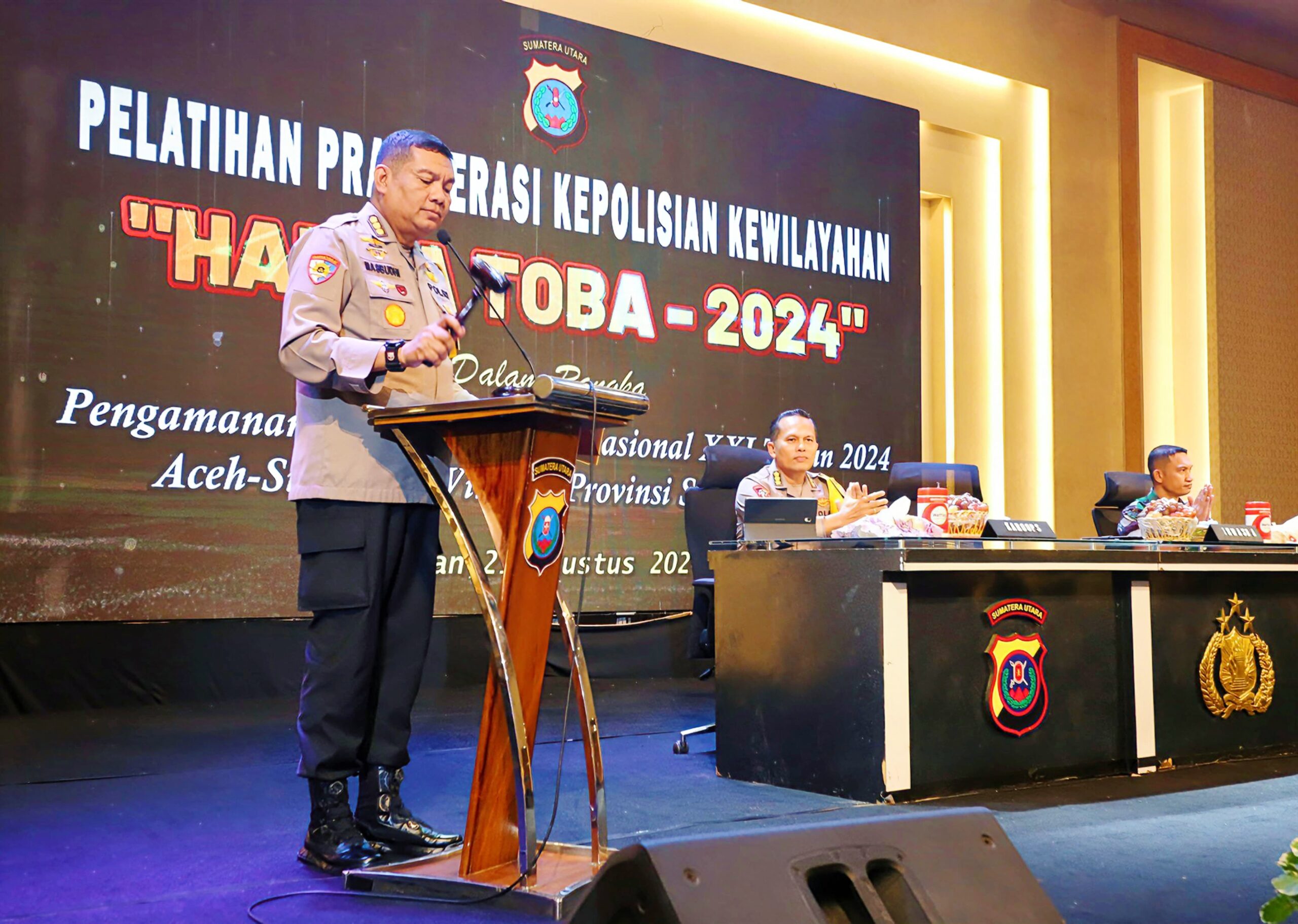 SERGAI || Patroli24jam — Kepolisian Resor Serdang Bedagai (Polres Sergai) turut serta mengikuti pelatihan (Lat Pra Ops) “Hatra Toba-2024” dalam rangka pengamanan Pekan Olahraga Nasional (PON) XXI 2024 Aceh-Sumut, di Tiara Convention Center, Rabu (21/08/2024).
