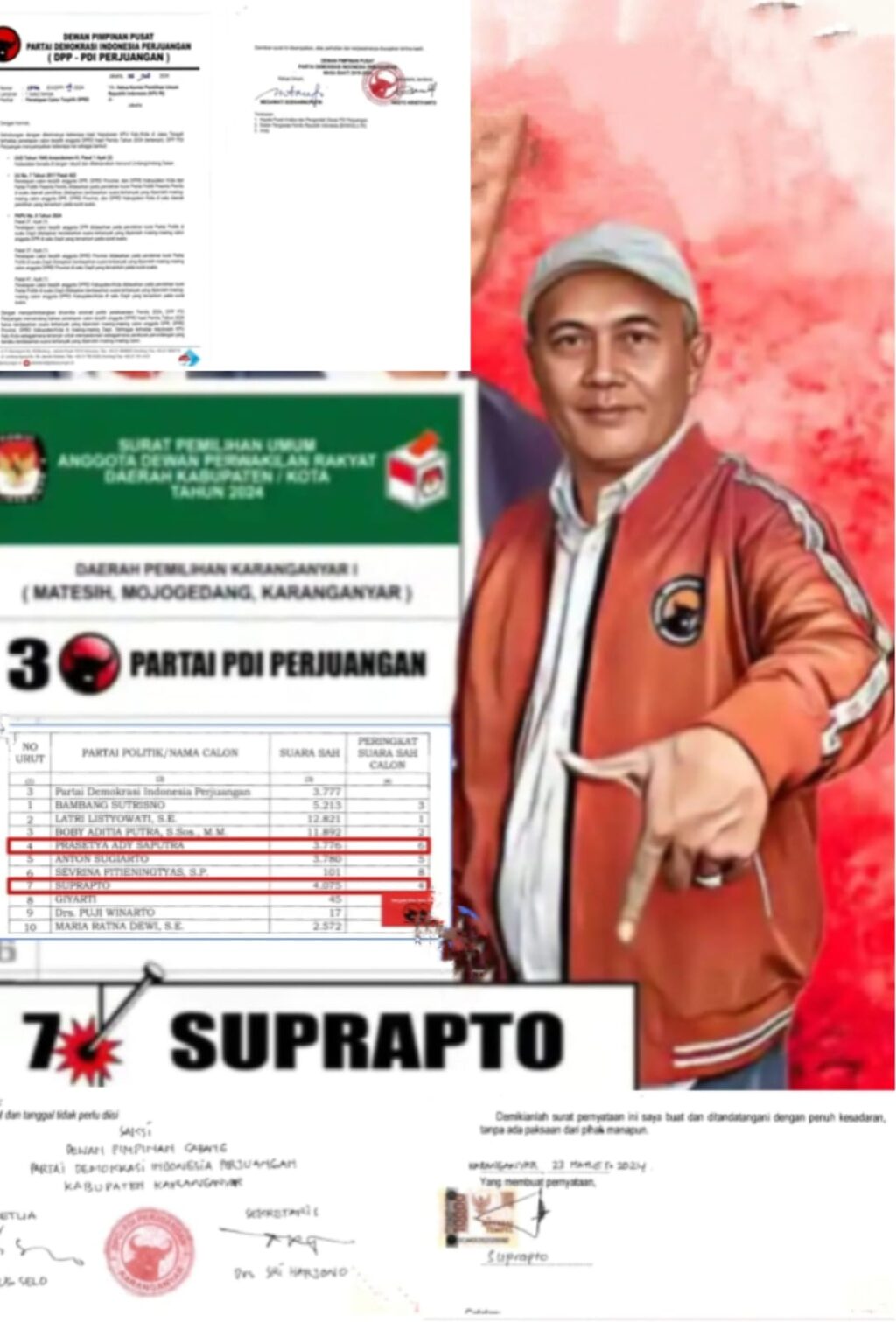 JAKARTA– Dugaan kolaborasi KPU Kabupaten Karanganyar dengan oknum pengurus DPC PDI Perjuangan Kabupaten Karanganyar yang telah melakukan mal administrasi untuk merubah SK KPU tentang penetapan Suprapto calon terpilih menjadi SK Perubahan Calon terpilih yang perolehan suaranya lebih sedikit dan merupakan pelanggaran berat Pemilu serta diusulkan ke Pj Gubernur Jawa Tengah.